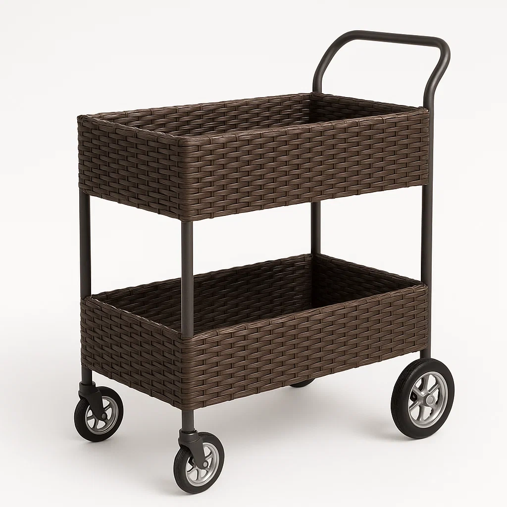 Carrito de ratán sintético marrón con ruedas y estructura metálica