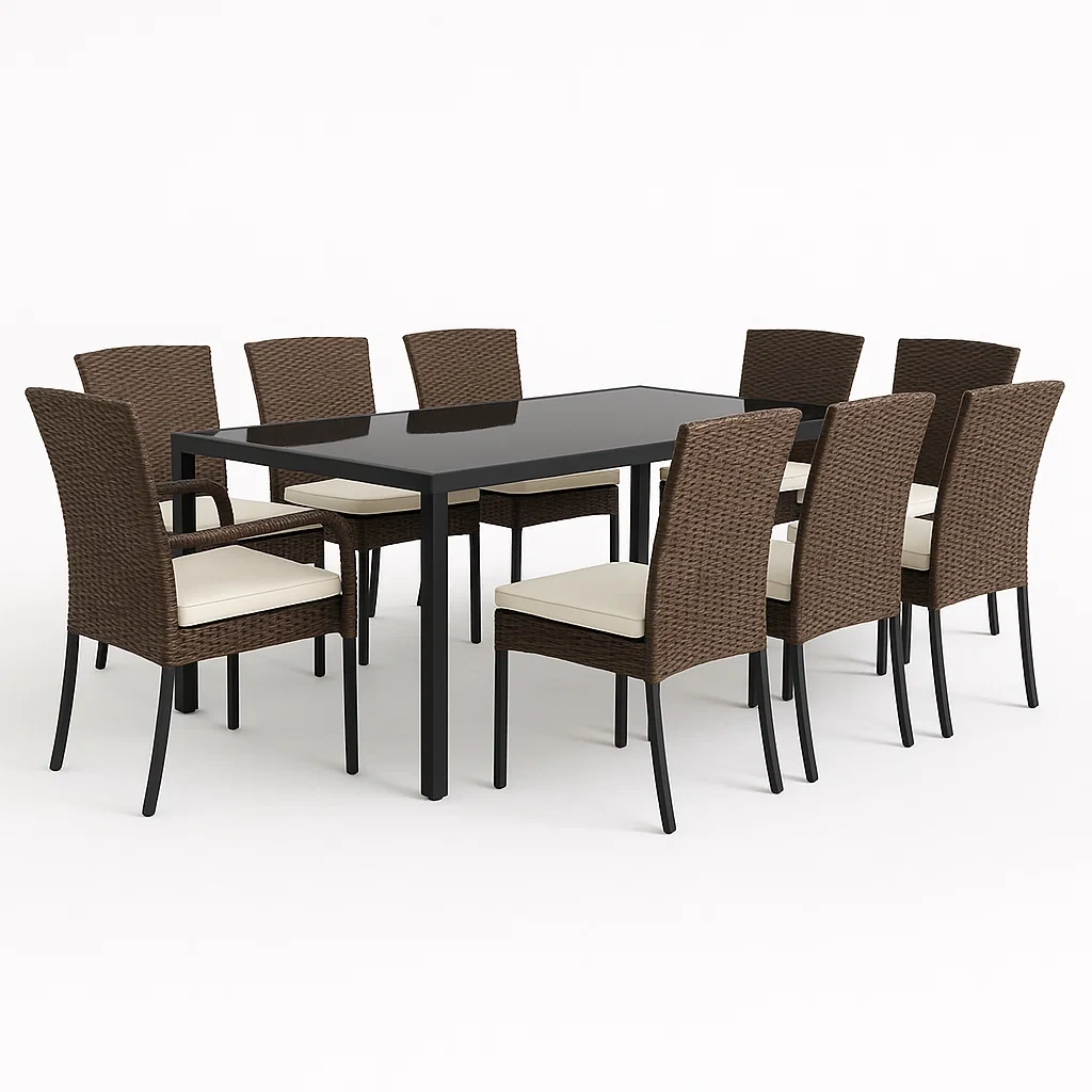 Conjunto de mesa y sillas de comedor exterior de 9 piezas mesa de vidrio negro sillas de ratán marrón cojines beige
