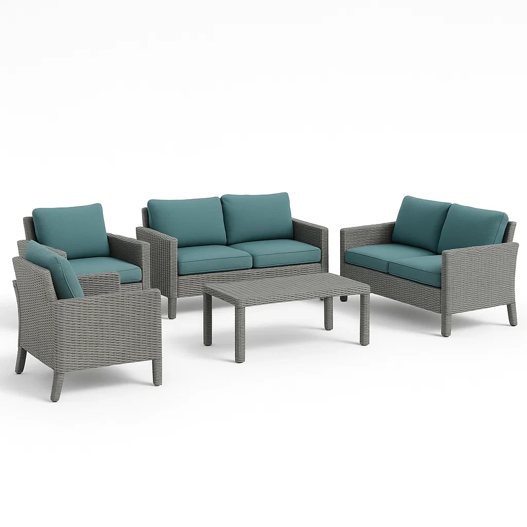 Conjunto de sofá de exterior de ratán sintético gris con cojines de poliéster turquesa