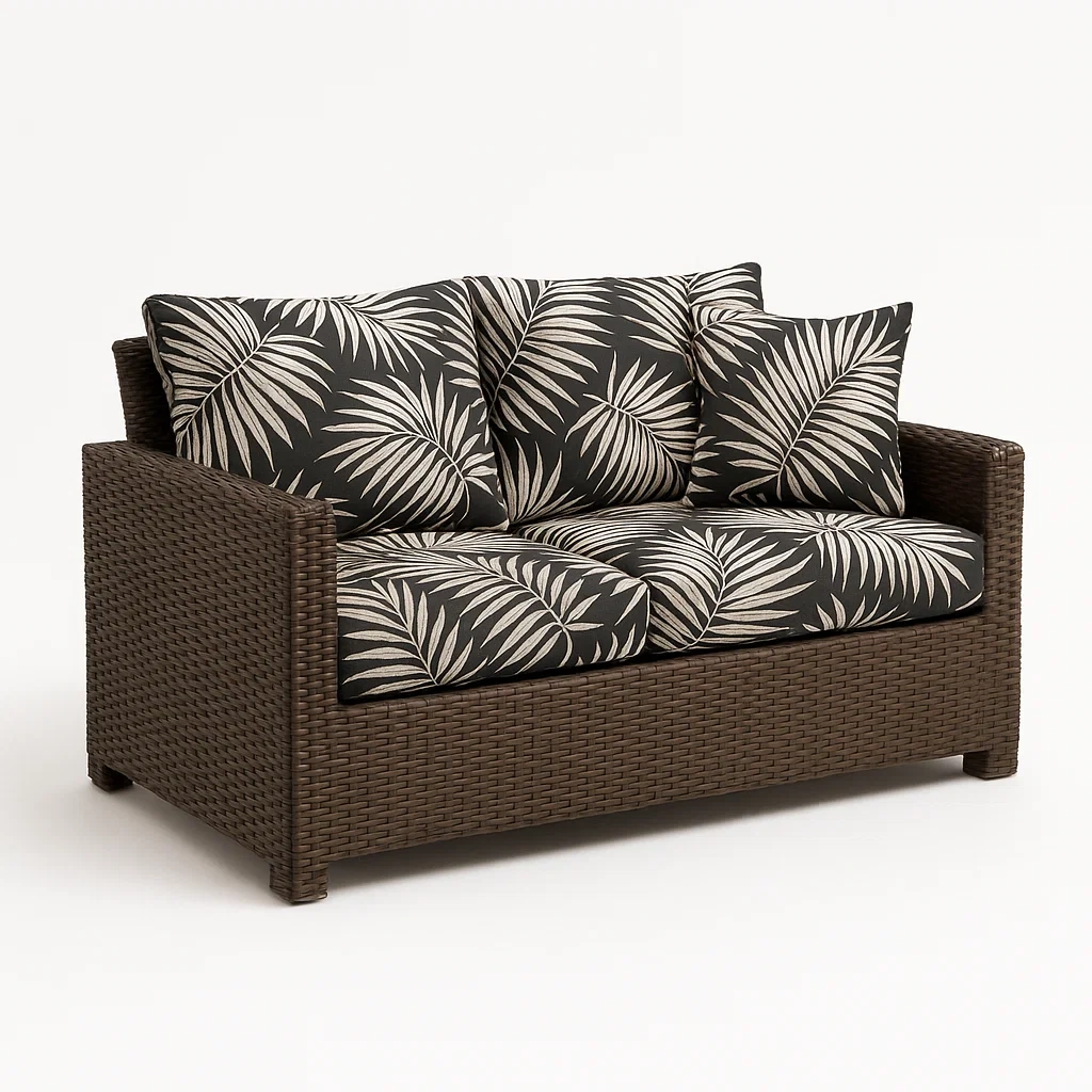 Sofá de ratán sintético marrón con cojines de poliéster negro y hojas