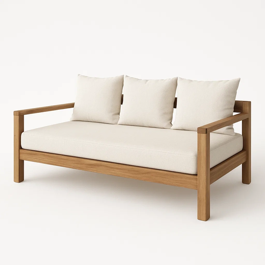 Material: Estructura de madera de roble, cojines de lino con relleno de espuma.