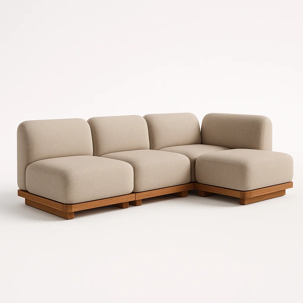 Este sofá seccional modular está tapizado en tela de poliéster y cuenta con una estructura de madera maciza. El color es beige.